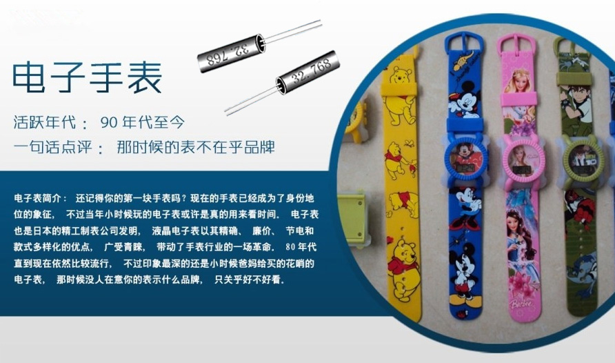 還記得小時候帶的電子手表嗎?電子表對我兒時的印象很深,記得讀小學三年級的時候班里有個同學他媽媽給他買了一塊電子表,很漂亮,因為是小孩子嗎?總喜歡拿著別人沒有的東西在別人面炫耀,隨著時間的過去班里有越來越多的同學都賣了電子表,后來有一天放學回到家里我就和我媽媽說我要買電子表,班里很多人都買了,可是媽媽沒有答應,那時候的電子表很便宜幾塊錢就能買到,可媽媽一直沒有跟我買,直到我讀四年級了那天我過生日,媽媽送給我一塊電子表當生禮物,當時特別高興,那是我擁有的第一塊電子手表。可是沒有帶多久有一次和同學玩耍時不小心把表給弄壞了,不動了,拿回家爸爸把表拆開來看能不能修好,當時我看到里面有很多奇奇怪怪的東西,也不知道是什么,可有一顆小東西到今天我接觸了這個行業才知道,原來它叫做晶振元件,是給電子表提供時間顯示的一顆電子元件。電子表最早由日本精工制表公司發明,而精工早期是做手表的,慢慢得也開始生產晶振,才會有今天的精工晶振品牌。