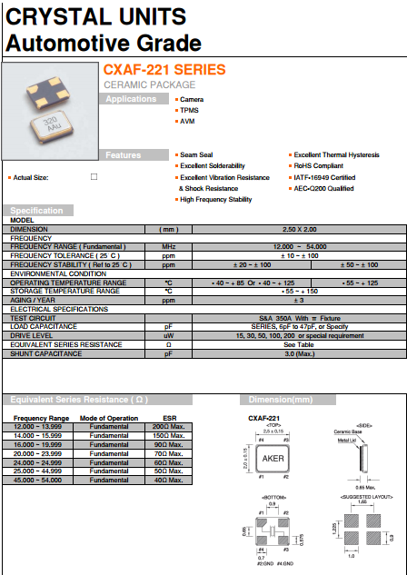 AKER晶振,AKER貼片晶振,CXAF-221諧振器.貼片石英晶體,體積小,焊接可采用自動貼片系統(tǒng),產品本身小型,表面貼片晶振,特別適用于有小型化要求的電子數碼產品市場領域,因產品小型,薄型優(yōu)勢,耐環(huán)境特性,包括耐高溫,耐沖擊性等,在移動通信領域得到了廣泛的應用,晶振產品本身可發(fā)揮優(yōu)良的電氣特性,滿足無鉛焊接的高溫回流溫度曲線要求.