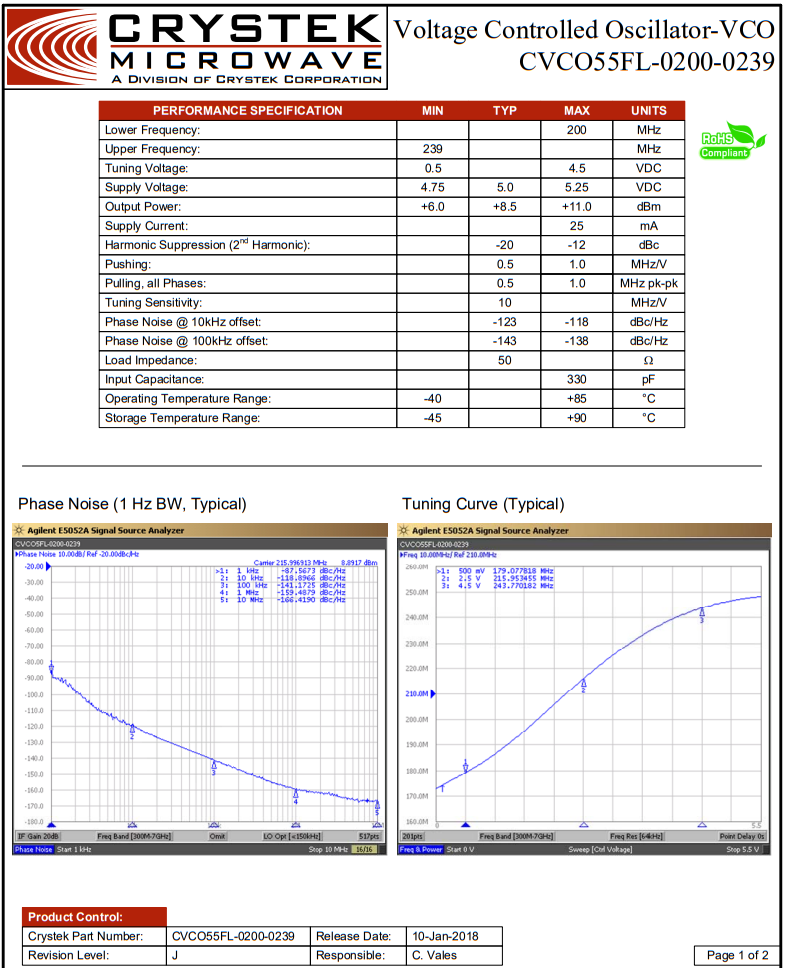 佛羅里達(dá)州Fort Myers - 2023年7月31日- Crystek的CVCO55FL-0200-0239 VCO(電壓控制振蕩器)工作范圍為200至239 MHz,控制電壓范圍為0.5至4.5 V。該壓控振蕩器的典型相位噪聲為-123 dBc/Hz @ 10 kHz偏置,具有出色的線性度。輸出功率通常為+8.5 dBm。